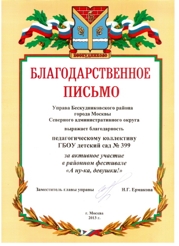 The player will show in this paragraph Наш яркий номер прошел на ура! Жюри высоко оценило мастерство и юмор наших артистов. Наши артисты и коллектив детского сада получили заслуженную награду от Управы района Бескудниковский: грамоту и ценный подарок. ![]() | |