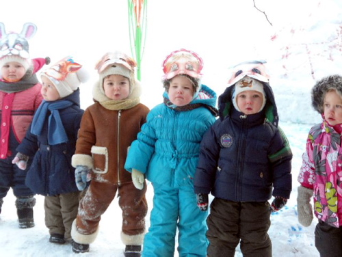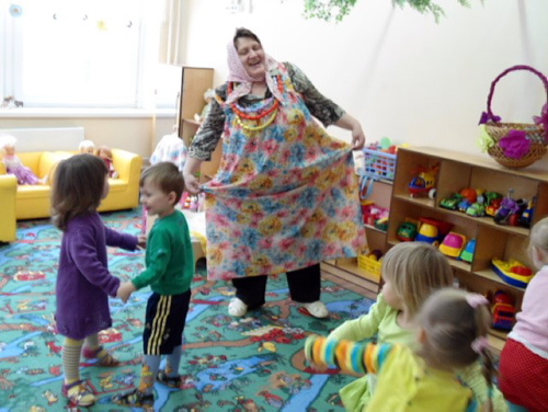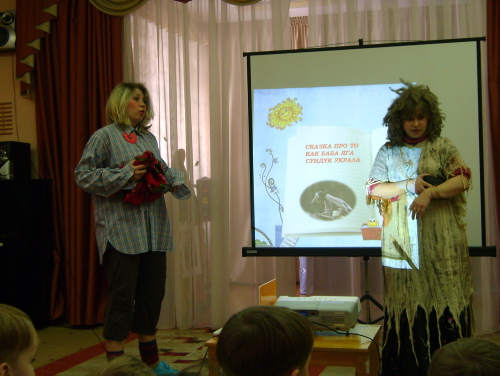 К нам в гости заходили домовенок Кузя с бабушкой Ягой, они позабавили детей и показали мультфильм.