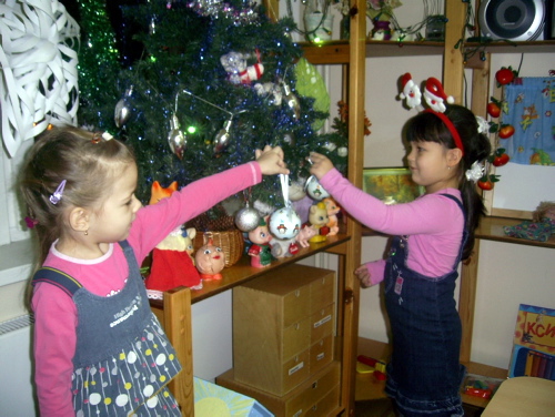 На этой неделе с большим удовольствием дети украшали группу. Елка засияла новогодними огнями и новыми игрушками. На окнах появились снеговики из детских ладошек и елочки из мишуры.