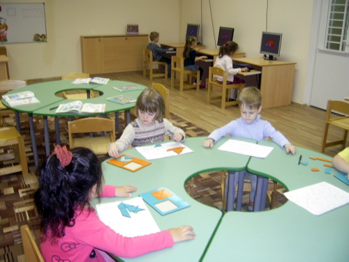 Очень динамичные уроки программирования проходят с Еленой Ивановной. Дети в тетрадях выполняют задания связанные с геометрическими фигурами.
