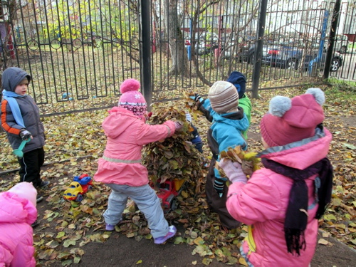 Золотая осень – прекрасная пора, но в тоже время, это и сильный листопад. Дети группы №7 на прогулке активно помогали своим воспитателям собирать листья: граблили маленькими грабельками, собирали лопатками листья, грузили в машину и складывали их в мешок.