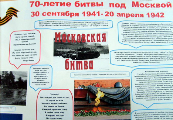 С начала учебного года по 5 декабря детьми группы № 9 собирались экспонаты для выставки к 70-летию битвы под Москвой. Дети приносили разные фотографии, которые сохранили их бабушки и прабабушки со времен войны, а так же игрушечные танки и военную технику. ![]() Про каждый экспонат дети рассказывали друг другу: откуда фотография и кто на ней изображен, а им про это рассказывали бабушки и прабабушки. ![]() А семья Болезновых подготовила семейную стенгазету, посвящённую битве под Москвой. ![]() 5 декабря дети нашей группы стали участниками литературно-музыкальной композиции «Москва непобежденная», которая прошла в музыкальном зале детского сада. | |