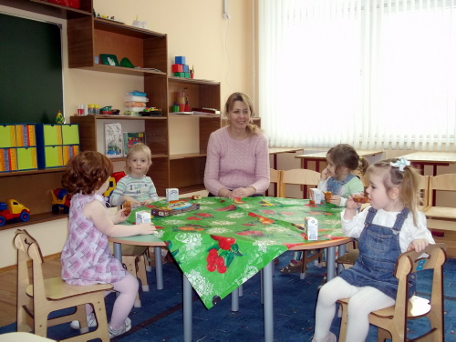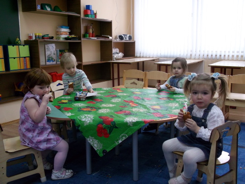 Мы заводим хоровод:  Именинница в круг встает (Каравай-каравай, кого хочешь выбирай!):   А потом – пир горой! И фотография на память – с воспитательницей (Геращенко Инессой Михайловной). |