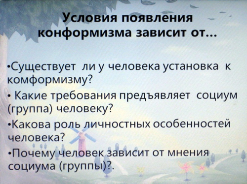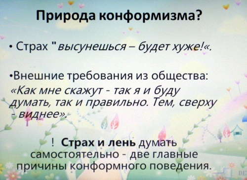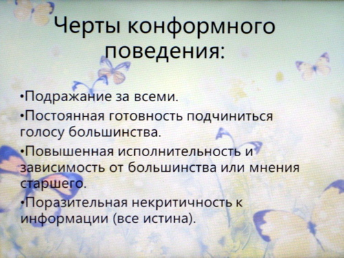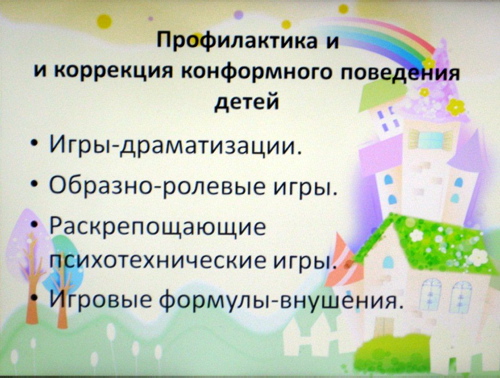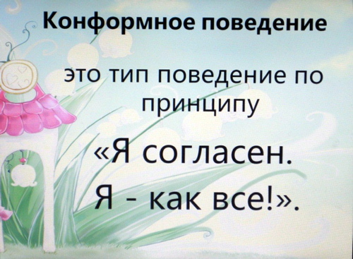 ![]() 03.12.2012 психолог Опрышко В.А. провела с педагогами ГБОУ детский сад №399 семинар на тему: « Профилактика конформного поведения среди дошкольников в условиях детского сада». 1. Обсуждение категорий детей, которые можно выделить в группах. ![]() 2. Представление понятий «Конформизм», «Конформность» и «Конформист». ![]() 3. Представление сведений о том, что лежит в основе конформизма. ![]() 4. Обсуждение вопроса: «Конформное поведение - это врожденное явление или приобретенный стиль поведения?» ![]() 5. Представление сведений о том, что этот тип поведения встречается в акцентуациях характера детей. ![]() 6. Просмотр и обсуждение фильма психолога В.С. Мухиной «Я и другие» 1971г., в котором наглядно показано как проявляется конформное поведение у детей и у взрослых. ![]() ![]() 7. Представление информации по работе с такой категорией детей (правильный подбор игр и использование стимулирующего эффекта в проявлении успешности). ![]() ![]() | |