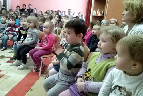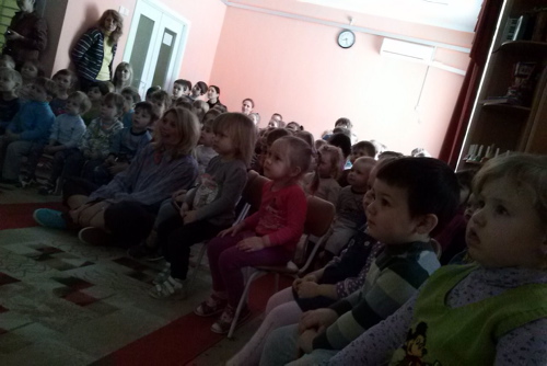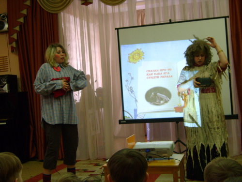 К нам в гости заходили домовенок Кузя с бабушкой Ягой, они позабавили детей и показали мультфильм.