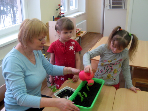 На занятиях по окружающему миру воспитатель знакомит ребят с ростом и развитием растений. Дети с увлечением ухаживают за ростками помидоров и огруцов: рассаживают, поливают и рыхлят землю.![]() ![]() | |