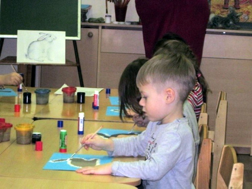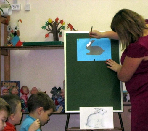 Сегодня к нам на занятие по художественному творчеству пришли в гости воспитатели из других групп, посмотреть, как мы рисуем белых, пушистых зайчиков.![]() К ребятам прибежал маленький зайчик, испугавшийся осени, потому что серую шубку надо было менять на белую. ![]() Мы с ребятками его успокоили и помогли ему. Занятие было сегодня необычное- рисование с элементами аппликации. Сначала мы наклеили серого зайчика на лист бумаги. ![]() А потом поменяли зайчикам шубки. Мы нарисовали много белых, пушистых зайчиков необычным методом – методом тычка. ![]() ![]() Ребятам очень нравится этот метод рисования. Потом мы даже превратились в маленьких зайчиков, поиграли. ![]() Зайчик очень обрадовался, что мы ему помогли. Теперь ему совсем не страшно будет зимой в лесу. ![]() ![]() Занятие провела- Саунина Анна Алексеевна. | |